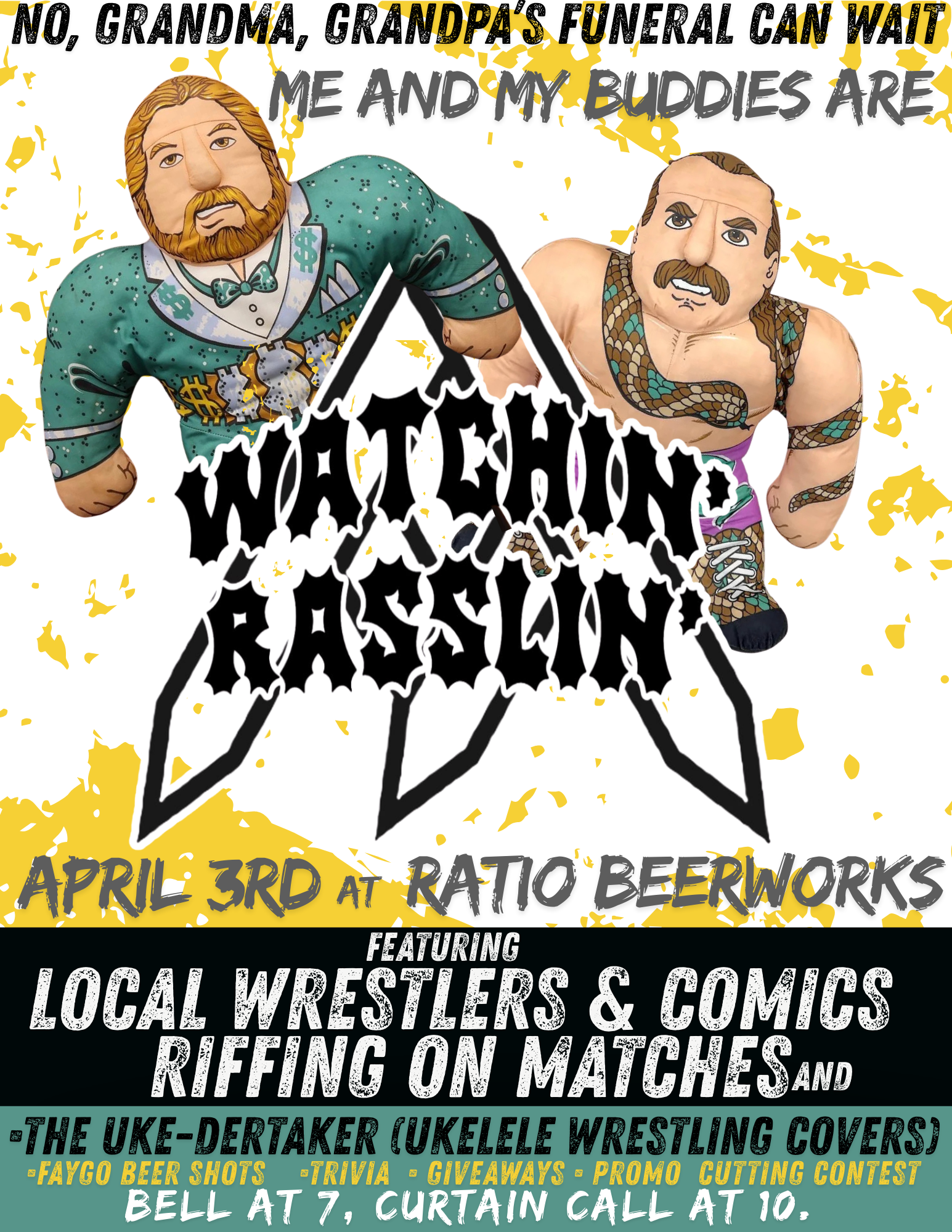 Local wrestlers & comics riffing on matches. PLUS Faygo beer shots, trivia, giveaways, promo cutting contest!